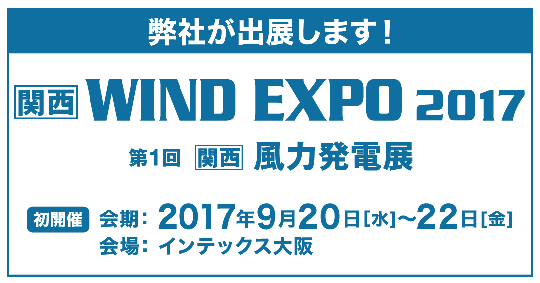 2017年9月20日(水)〜9月22日(金)にインテックス大阪にて開催される、スマートエネルギーweek 2017 風力発電展WIND EXPO2017に出展します。